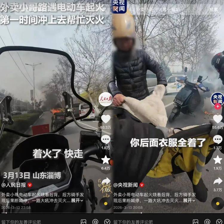 淄博,暖意漫城,善意涌动。近日,周村街头,外卖骑手许卫萌遇同行电动车突发起火,对方后背衣物引燃却浑然不觉,他不顾危险挺身而出,徒手剥去四层着火衣物成功救人,这一义举感动全网,被多家央媒转发,让淄博的城市温度再次被全国看见。